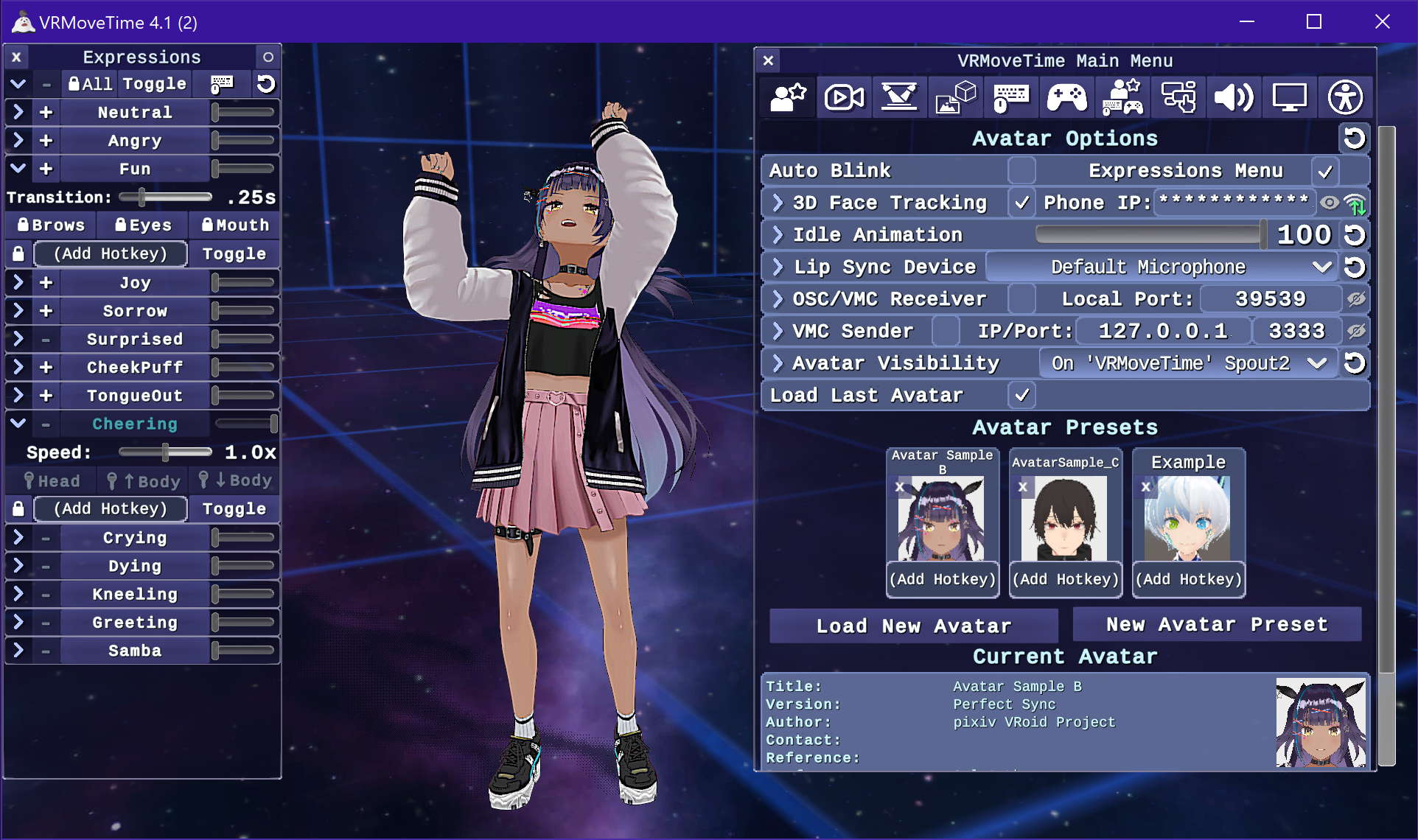 An application for VTubers that combines seamless 3D-movement and animations together with face/body tracking, toggle-able props, camera and avatar position presets, and customizable hotkeys for everything! The download includes two sample avatars with "Perfect Sync" expressions already added.