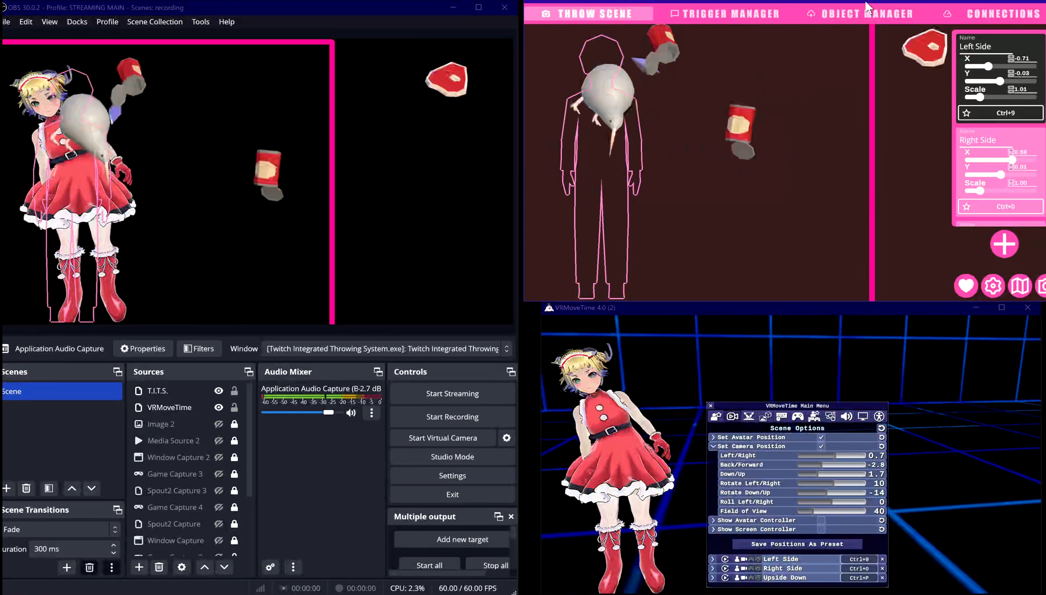 To get it working, you just need to enable the "VSeeFace" integration in T.I.T.S., and make sure the OSC/VSC Receiver option is checked in VRMoveTime with the default port. You can use position presets (Scene Options/2nd tab in VRMT) and scenes menu hotkeys in T.I.T.S. to ensure your avatar is in the right position to be hit by stuff within OBS. Here's a video that shows how it works: